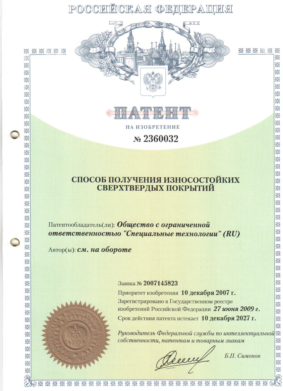Patent for invention "The technique of production of wear-resistant superhard coatings"