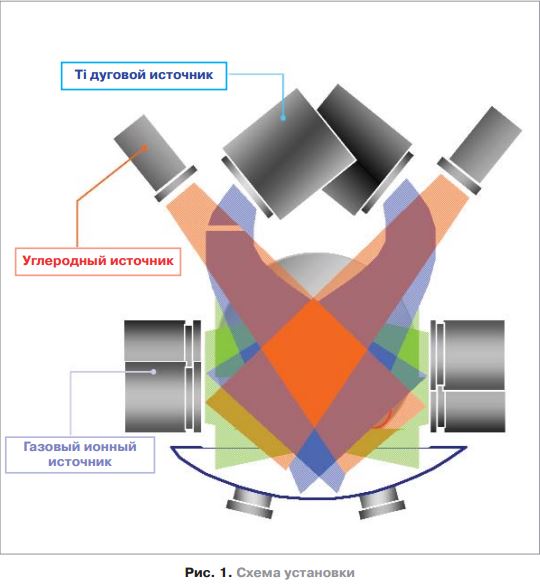 Технология нанесения алмазоподобных покрытий (или, в английской аббревиатуре, DLC, что означает Diamond Like Coating) сводится к плазменному импульсному распылению графита в вакуумной камере и осаждению (или, в английской аббревиатуре, PVD сокращенное от английских слов physical vacuum deposition) ионов углерода с достаточно большой энергией на изделия, на пример металлообрабатывающий инструмент (рис. 1). В результате такого напыления углерода образуется аморфное покрытие, состоящее из атомов углерода как с алмазными, так и с графитоподобными связями. Такие аморфные покрытия можно получать в широкой области температур вплоть до комнатной на различных материалах: металлах, керамике, стекле, пластических материалах.