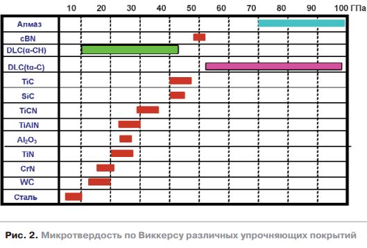 Высокое содержание атомов углерода с алмазными связями в присутствии графитоподобных атомов приводит к появлению уникальных характеристик алмазоподобных покрытий, таких как высокая твердость, сравнимая с чистым алмазом (рис. 2); низкий коэффициент трения, характерный для графита (см. таблицу); высокая износоустойчивость; химическая инертность; биосовместимость с живыми тканями; экологическая чистота. При этом из всего массива ныне применяемых упрочняющих покрытий алмазоподобные покрытия имеют наибольшую микротвердость (рис. 2) и наименьший коэффициент трения. Микротвердость широко используемых покрытий составляет величины от 10 до 45 ГПа, определенные по методу Виккерса. В то же время для АПП, полученных методом плазменного импульсного распыления графита в вакууме и называемых DLC (tαC), микротвердость лежит в пределах значений от 50 до 100 ГПа и вплотную приближается к чистому алмазу. По этому критерию покрытия DLC (tαC) не имеет аналогов.