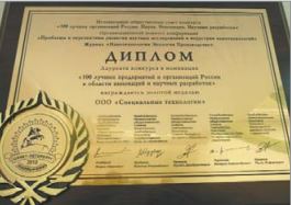 В 2010 г. за данный проект компания получила звание лауреата конкурса "100 лучших предприятий в области инноваций и научных разработок" и удостоена почетных наград диплома лауреата конкурса и золотой медали "100 лучших предприятий в области инноваций и научных разработок". Награды подписывали и вручали: нобелевский лауреат, академик РАН Ж.И. Алферов, председатель Комитета Государственной Думы по науке и наукоемким технологиям академик РАН В.А. Черешнев и другие крупнейшие российские ученые.